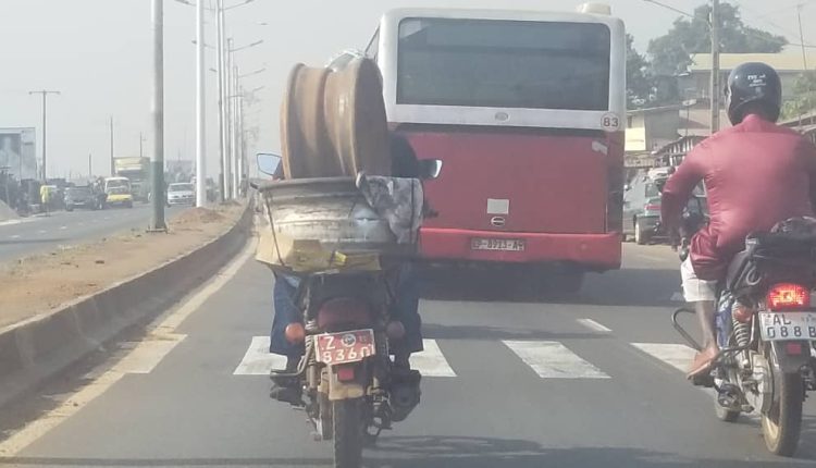 A travers nos villes et villages, il y a des cas, tout aussi originaux qui se présentent. Partout, les motos transportent des colis, comme des marchandises, des caisses, des ballots, des appareils électroniques, des ovins et caprins vivants, des matelas, des tôles, des barres de fer, des couples et leurs enfants, des femmes en grossesse, des malades et même…des morts !