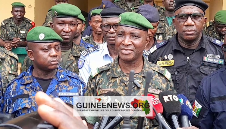 « Nous savons tous que depuis le mois de Ramadan, l’insécurité a pris un élan inacceptable. Des bandits de grands chemins, ont coalisé pour faire du mal à la population de Kankan. Hier aux environs de 15 heures, 3 bandits sur une moto, ont attaqué un kiosque Orange Money. Ils ont emporté une somme de 17 millions et tué un jeune innocent sur leur passage. Nos patrouilles mixtes des agents des forces de défense et de sécurité qui sillonne la ville, appuyés par des citoyens républicains, ont été alerté et se sont mis à la trousse de ces bandits. Étant pourchassés, ils ont préféré quitter la ville pour aller dans un village situé à environs quelques 5 à 6 kilomètres. Nous avons alerté le chef de district de ce village. Aussitôt ; c’est tout le village de Dalala notamment les chasseurs traditionnels, qui s’est mobilisé pour barricader les routes. Voici comment, ils se sont fait prendre grâce à la collaboration des citoyens du district de Dalala. Un des bandits, celui qui détenait l’arme est allé se cacher dans les buissons la nuit. Dès qu’il a armé son fusil, les chasseurs traditionnels qui était à côté ont compris et ont ouvert le feu sur lui et saisi son arme. Le deuxième, avec l’arrivée de la patrouille, on a pu mettre main sur lui vivant. Ils ont été présentés aux gouverneurs et amené au camp. Arrivé là, le bandit qui a été pris vivant, nous a dit qu’il pouvait nous conduire vers une femme qui garde leurs armes. De 23 heures à 2 heures du matin, il nous a fait tourner à travers Kankan. Finalement on a compris que c’est une femme inexistante. A 2 heures du matin, il pensait que nous sommes fatigués, sur la route de Kissidougou, au niveau du deuxième pont, au quartier Bordo, Il a sauté du véhicule pour tenter de se cacher dans les bois. Tandis que les rumeurs de leur arrestation avaient déjà commencer à circuler. Nous ne savions, comment venir expliquer à la population de Kankan, que le bandit s’est échappé de nos mains.  Nous ne pouvions pas nous permettre de venir faire ce compte-rendu.  C’est ainsi que les agents ont pris leur responsabilité, il a été abattu dans sa course, il est tombé.  Tous les deux corps ont été transférés aux services compétents pour des fins d’examen. L’arme saisi sur le bandit et les 2 boîtes chargeurs, bien garnie, sont à notre disposition ici au camp pour toute fin utile », a-t-il déclaré.