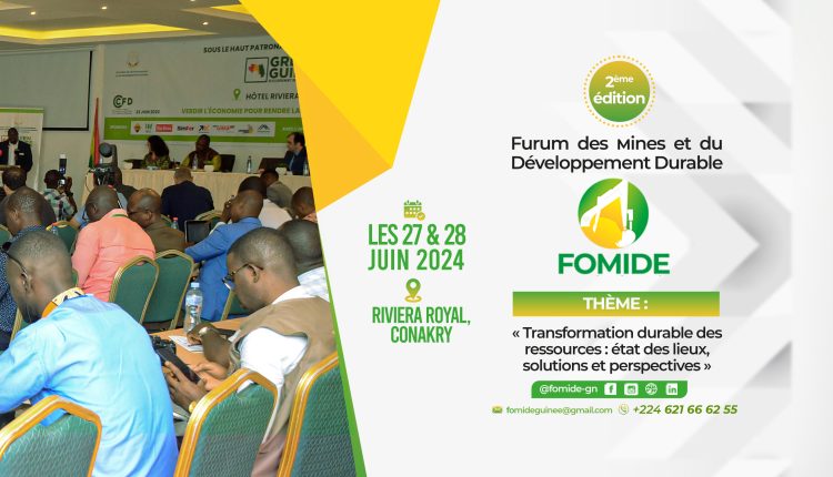 Conakry, le 28 mai 2024, Nous avons le plaisir d’annoncer la tenue de la deuxième édition du Forum des Mines et du Développement Durable (FOMIDE) qui se tiendra les 27 & 28 juin 2024 au Riviera Royal, à Conakry.