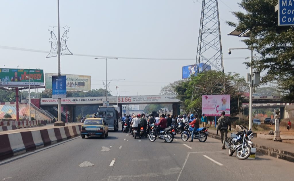 Ce lundi 6 janvier 2025, au niveau du Pont 8 novembre, l’on assiste à l’interdiction d’accès au centre-ville de Kaloum pour les taxis-motos, ainsi que l’obligation pour les autres conducteurs de motos de présenter un badge de travail prouvant leur activité professionnelle dans cette zone.