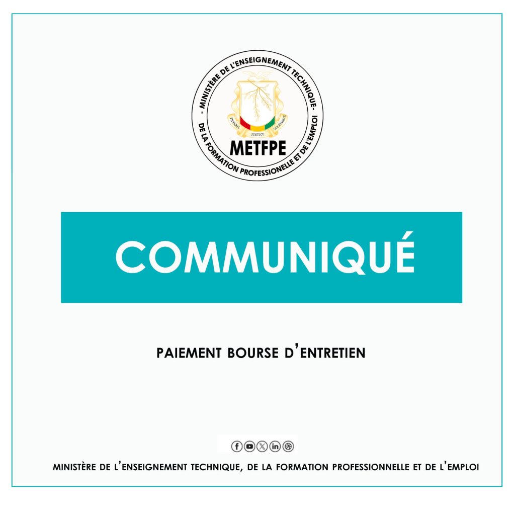 Conakry, 5 février 2025 – Le Ministère de l’Enseignement Technique, de la Formation Professionnelle et de l’Emploi (METFPE) informe l’ensemble des apprenants que la procédure de paiement des bourses d’entretien débutera officiellement à partir du vendredi 7 février 2025.