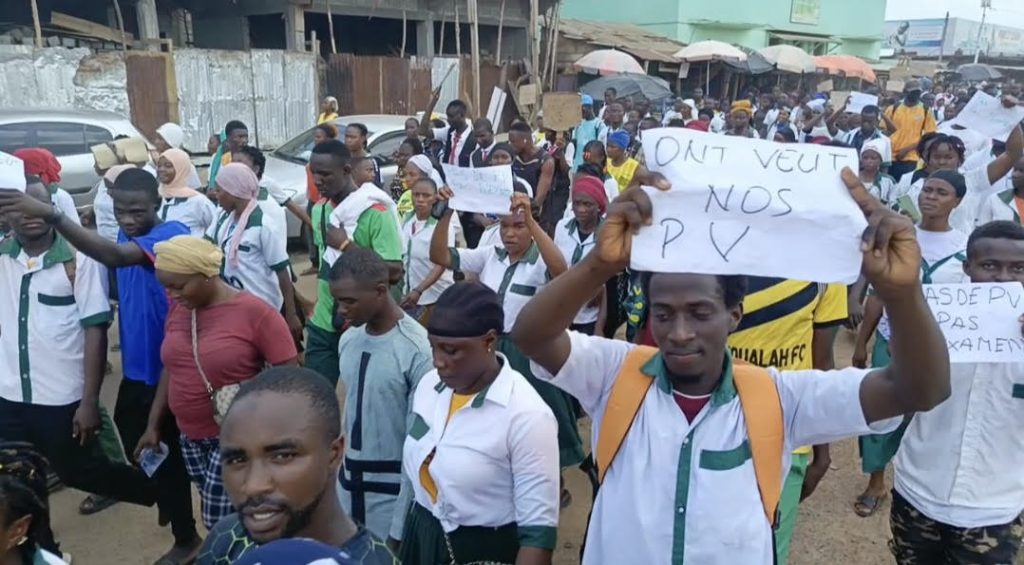 À la veille du lancement des examens de sortie, une vive tension a secoué la ville de Nzérékoré ce mardi. Plusieurs étudiants issus des écoles d’enseignement technique et de formation professionnelle privées, ont organisé une marche pacifique pour réclamer leurs procès-verbaux (PV) d’examen, condition indispensable pour accéder aux salles d’examen.