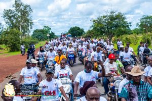 À l’approche de la ville, la route était déjà occupée. Des groupes de motards ouvraient la voie, moteurs lancés, klaxons répétés en rafale pour signaler le passage de la délégation. Des femmes alignées au bord de la chaussée entonnaient des chants d’accueil, accompagnés de cris de joie. Plusieurs jeunes portaient des teeshirts blancs imprimés d’un large « OUI » en rouge, suivi de la mention « à la nouvelle Constitution » en dessous : visuel simple, lisible, répété dans la foule comme un mot d’ordre.