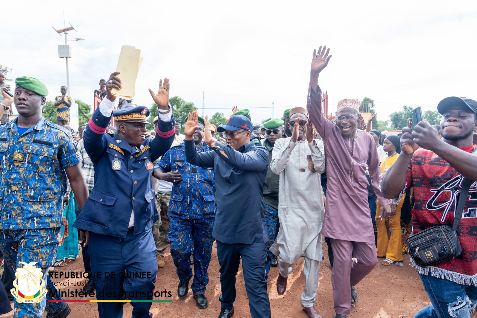 Sur le terrain, Ousmane Gaoual Diallo portait une tenue bleu nuit unie : tunique à patte de boutonnage frontale et fin liseré tonsurton, pantalon assorti. Chaussures noires cirées. Casquette bleu foncé ornée d’un marquage rouge, lunettes fumées, montre poignet gauche. Une présentation simple et fonctionnelle, adaptée au déplacement routier comme aux rencontres publiques. Son choix de rester debout, au même niveau que les citoyens lors de plusieurs arrêts intermédiaires, a renforcé la perception de proximité.