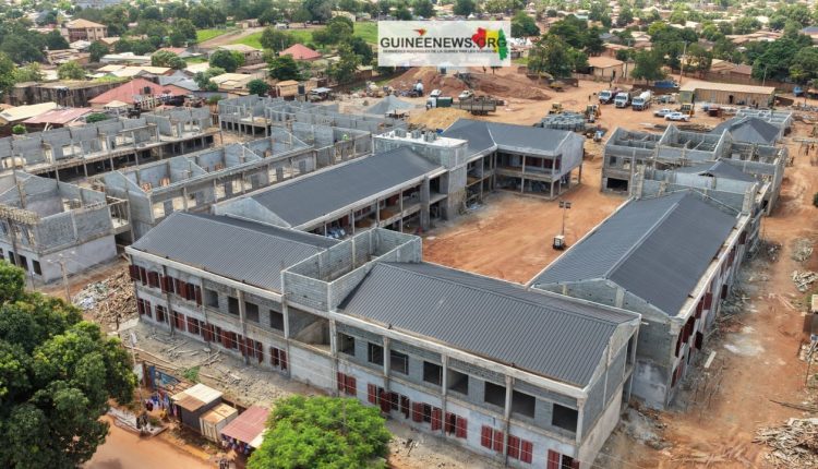 Le grand marché de Siguiri : Un ouvrage d’envergure comprenant 816 boutiques et hangars, ainsi que deux blocs de douze latrines chacun. Le bâtiment principal est bouclé, et l’équipe de GTMC est sur la dernière dalle de la place aux vendeuses.
