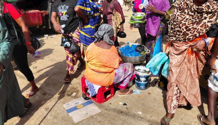La tenancière, assise à même la rue, a le dos tourné. On voit sa marmite sur le fourneau et les bols plastiques qu’elle utilise pour servir à manger à ses clients. En plein tumulte du marché, s’il vous plaît ! Nous noterons bien qu’il s’agit là, d’un type de restaurant, assez original, en tout cas, parfaitement curieux. En effet, il est en plein air, à même la route. Où est la place réservée aux clients pour se restaurer ? Que leur propose-t-elle, comme menu ? On remarque qu’il y a beaucoup de passants alentour. Un camion semi-remorque est garé de l’autre côté de la chaussée. Quelques femmes entourent la restauratrice, assise sur un escabeau. L’une d’entre elles semble être une cliente qu’on vient de servir. Elle tient en mains, un récipient plastique qui semble le prouver. Un plat à emporter ? Allez savoir ! Nous n’avons pas eu l’opportunité d’en savoir davantage, bousculé et interrompu de toutes parts, que nous avons été, par les va et vient incessants et les bruits sans limite qui caractérisent la zone. Nous sommes sur une allée, en plein marché, sur la route de l’échangeur, qui mène au rond-point de Madina.
