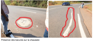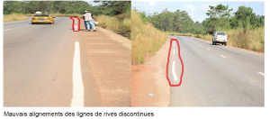 Pour cette dernière partie portant sur la mission effectuée par l’Agence Guinéenne de la sécurité Routière (AGUISER), conduite par M. Yéké Bérété, son directeur général adjoint, sur la route Coyah-Mamou, à l’effet de ‘’constater les travaux de marquage et panneaux réalisés, relever les anomalies et faire des recommandations, nous parlerons de la signalisation horizontale, communément appelé, marquage au sol. Là également, il a été relevé de multiples erreurs et manquements, qui doivent être corrigées sans délai, puisque préjudiciables à la sécurité de la circulation.