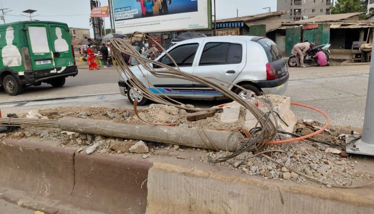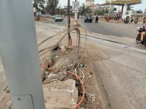 Que l’on soit un piéton qui déambule ou qui traverse la rue, un marchand debout, qui vend, un étalagiste qui s’installe sur le terre-plein central, un mendiant qui fait des va et vient, demandant l’aumône ou un usager de passage, cette image est très suggestive. On en voit bien de pareille, ici et là, le long de nos rues. Mais, est-ce qu’on y attache un tant soit peu d’importance ? Est-ce qu’on y prête beaucoup d’attention, pour réfléchir à ce qui aurait pu arriver, si ça avait été un piéton anonyme ou nous-même qui s’était trouvé là, à la place de ce pylône. Voyez-le (ce pylône ou ce qu’il en reste), quoiqu’en béton armé, le choc qu’il a subi, l’a cassé, tordu, brisé en mille morceaux, laissant apparaître les fers, pliés, comme si c’était une armature pour construire un caniveau.