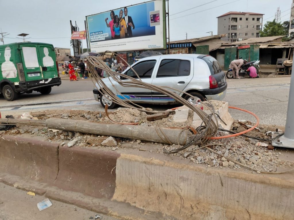 Que l’on soit un piéton qui déambule ou qui traverse la rue, un marchand debout, qui vend, un étalagiste qui s’installe sur le terre-plein central, un mendiant qui fait des va et vient, demandant l’aumône ou un usager de passage, cette image est très suggestive. On en voit bien de pareille, ici et là, le long de nos rues. Mais, est-ce qu’on y attache un tant soit peu d’importance ? Est-ce qu’on y prête beaucoup d’attention, pour réfléchir à ce qui aurait pu arriver, si ça avait été un piéton anonyme ou nous-même qui s’était trouvé là, à la place de ce pylône. Voyez-le (ce pylône ou ce qu’il en reste), quoiqu’en béton armé, le choc qu’il a subi, l’a cassé, tordu, brisé en mille morceaux, laissant apparaître les fers, pliés, comme si c’était une armature pour construire un caniveau.