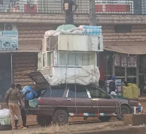 Quelle hauteur de bagages, sur une voiture, me direz-vous ! Eh, oui, vous avez bien raison d’émettre une pareille remarque. D’ailleurs, on continue encore de le charger, cette fois, dans la malle arrière (le coffre). En haut nous avons des réfrigérateurs, qui sont des objets lourds. Et si jamais, ils tombent devant un usager qui vient par l’arrière. On peut imaginer la suite. C’est une catastrophe assurée !